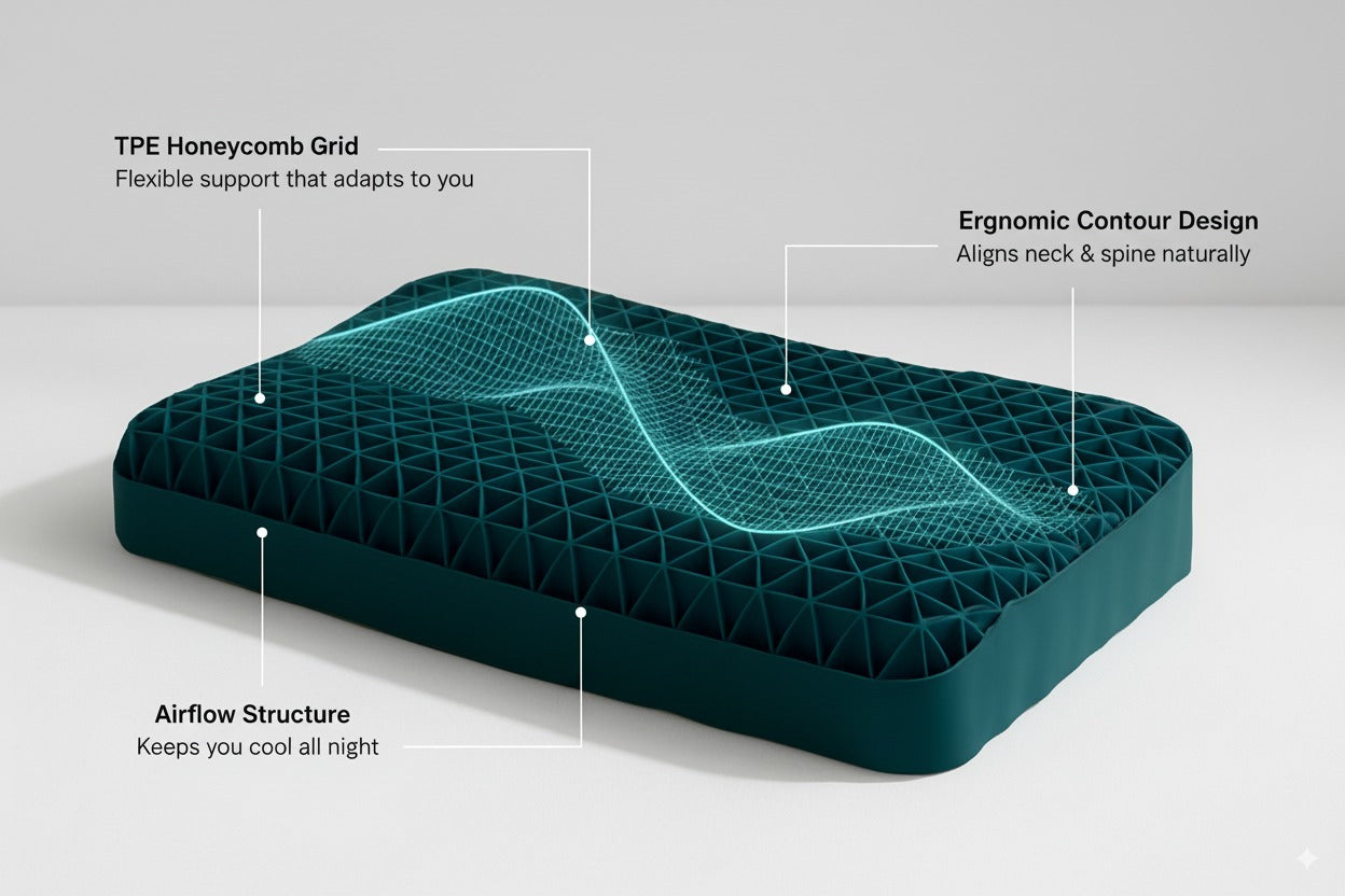 Onyx AeroMatrix was engineered with your health and recovery in mind. From its sci-fi honeycomb grid to its ergonomic contour, every detail is designed to align your head and neck, relieve pressure, and keep you cool all night — so you wake up clear, energized, and pain-free.