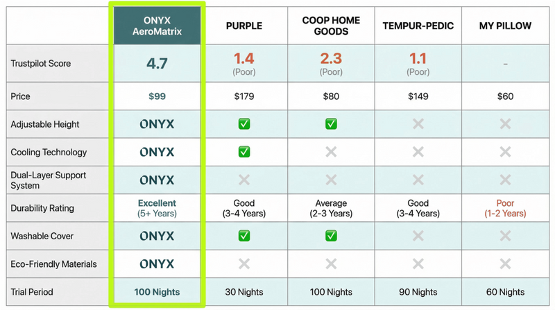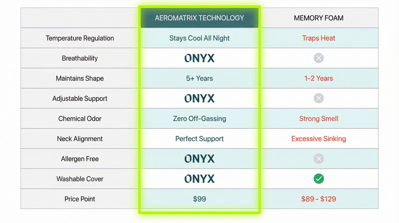 Most pillows collapse by morning. The Onyx AeroMatrix™ Pillow was engineered to hold its shape all night - so you wake up without the neck pain.